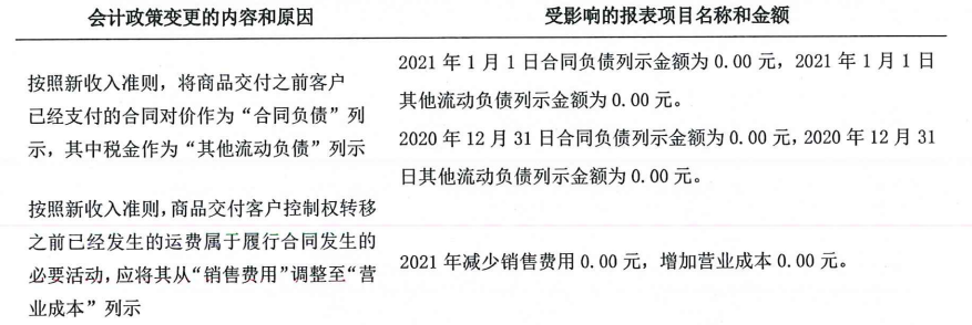 (2)公司自202111日采用《企业会计准则第14收入》(财会(2017) 22)相关规定,根据累积影响数,调整期初留存收益及财务报表其他相关项目金额,对可比期间信息不予调整。会计政策变更导致影响如下: