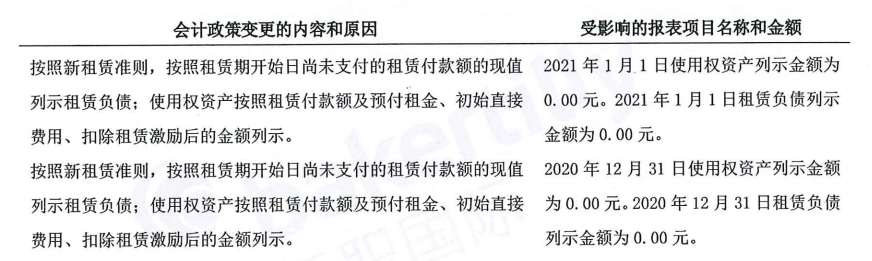 (3)公司自202111日采用《企业会计准则第21租赁》(财会(2018) 35)相关规定,根据累积影响数,调整使用权资产、租赁负债、年初留存收益及财务报表其他相关项目金额,对可比期间信息不予调整。会计政策变更导致影响如下:
